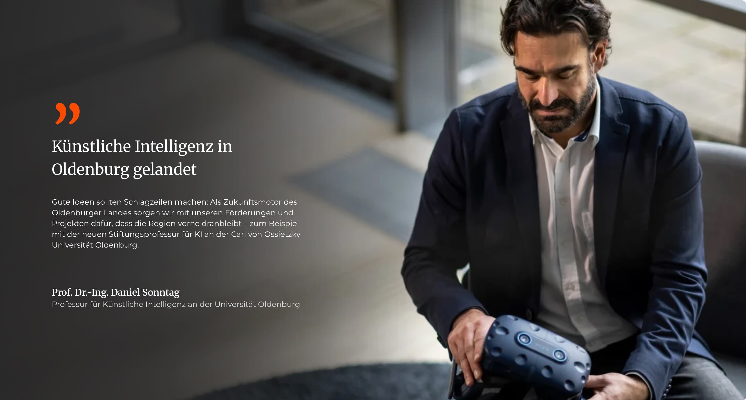 Der Lehrstuhl für Künstliche Intelligenz an der Universität Oldenburg ist seit November 2020 besetzt: Prof. Dr. Daniel Sonntag hat die Stiftungsprofessur "Angewandte Künstliche Intelligenz" am Department für Informatik übernommen. Die Professur wird vom KLEINEN KREIS, der CEWE Stiftung & Co. KGaA, der EWE AG, der BÜFA GmbH & Co. KG, der OLB-Stiftung, Dr. Caroline Neumüller, Alexander Neumüller und der Stiftung der Metallindustrie im Nord-Westen finanziert. In seiner Forschung am AAI konzentriert sich Professor Daniel Sonntag auf interaktives maschinelles Lernen. Bei diesem Ansatz erhalten Computer menschliches Feedback zu ihren Aktionen und erfassen gleichzeitig Daten automatisch, beispielsweise durch Eye-Tracking oder Bilderkennung. Ziel ist es, diesen Prozess weiter zu optimieren – mit dem Ziel, Maschinen zu befähigen, reibungsloser und schneller von Menschen zu lernen.