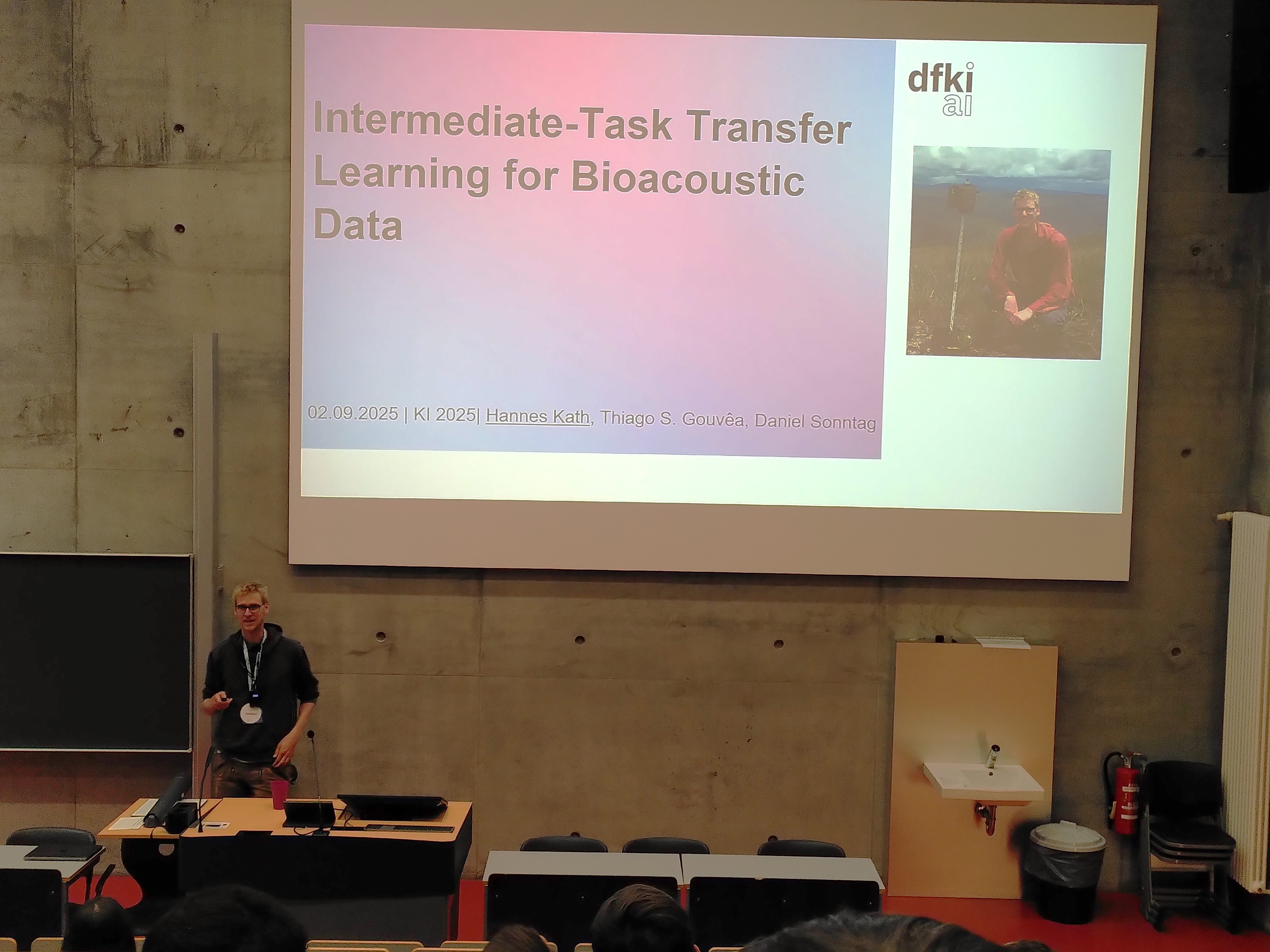 Hannes Kath vom Lehrstuhl für Angewandte Künstliche Intelligenz der Universität Oldenburg und der Abteilung Interaktives Maschinelles Lernen hat auf der KI2025-Konferenz in Potsdam das Forschungspapier „Intermediate-Task Transfer Learning für bioakustische Daten“ vorgestellt.