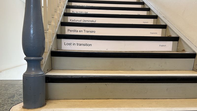 Wo Wandel stattfindet, geht mitunter auch etwas verloren. Zwei Installationen, die sich diesem Aspekt widmen, erwarten die Besucherinnen und Besucher im Treppenhaus der zweistöckigen Ausstellung. Mit „Lost in Transition – Lost in Transcription“ deutet Lina Antonia Helms auf den Verlust von Sprache, der mit Wandel einhergehen kann, hin. Dazu hat sie den Ausstellungstitel in verschiedene Sprachen übersetzt und auf die Treppenstufen geklebt. Mit jeder Stufe und jeder Übersetzung verändert sich neben der Sprache auch die Bedeutung der einzelnen Wörter. Ihre Kommilitonin Zoe-Melisande Schulte zeigt mit ihrem Werk „Lost and Found“ alltägliche und skurrile Fundstücke, die sie in Oldenburger Fundbüros fotografiert hat.