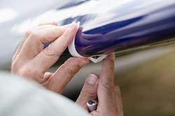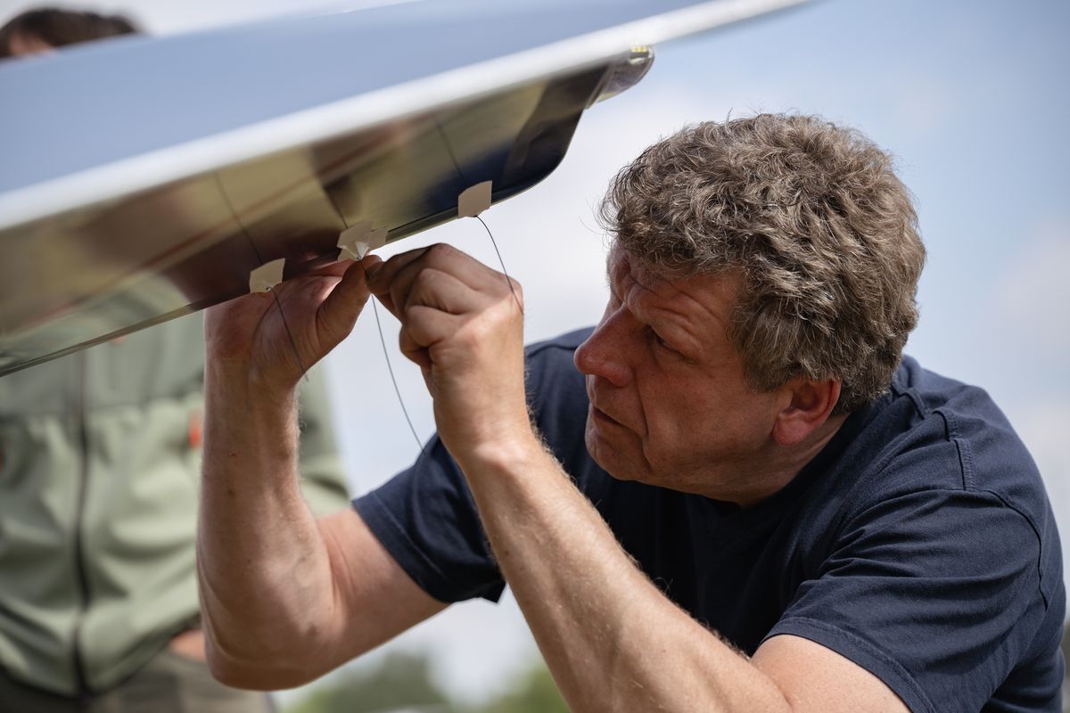 Insgesamt sechs Funksender brachten die Forschenden – hier: Techniker Mario de Neidels – an den Tragflächen und am Fahrwerk des Flugzeugs an. Ziel des Experiments war es, die Sender zu kalibrieren: Die Flugroute, die sich aus den Signalen der Sender bestimmen lässt, sollte mit der durch GPS im Flugzeug ermittelten Route abgeglichen werden.