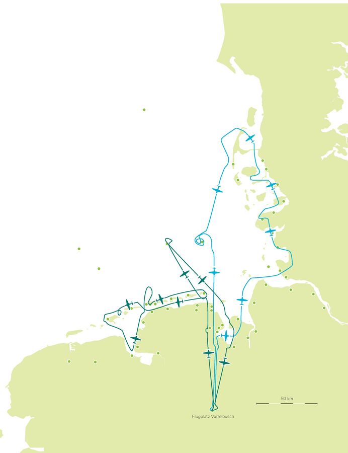 Für das Experiment flog das Team an zwei Flugtagen typische Wanderwege von Zugvögeln entlang der Nordseeküste nach. Dabei passierten sie zahlreiche Empfangsantennen des Motus-Netzwerks (grüne Punkte). Zunächst flog das Team an der Westküste von Schleswig-Holstein mit Zwischenlandung auf Föhr bis nach Sylt und von dort aus über Helgoland wieder zurück nach Varrelbusch. Der zweite Flug führte am Jadebusen und den Ostfriesischen Inseln entlang bis nach Emden. Ein Abstecher ging zu einem Feuerschiff in der Nordsee. Doktorand Georg Rüppel nutzt die gewonnenen Daten für ein Modell, das die Flugwege der besenderten Tiere in Zukunft zuverlässiger berechnen soll. So wollen Forschende beispielsweise ermitteln, wo kleine Zugvögel bei Nacht unterwegs sind und ob sie Windparks eher durchqueren oder meiden.