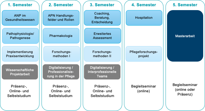 Der Studiengang Pflege – Advanced Nursing Practice ist berufsbegleitend konzipiert. Die Regelstudienzeit beträgt fünf Semester.