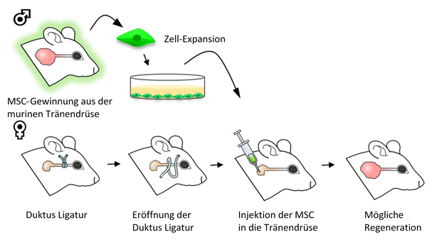 Ziel dieses Projektes ist es daher zu untersuchen, ob die Applikation von MSC die Geweberegeneration der Tränendrüse verbessert. Dazu sollen MSC nach experimentell induziertem trockenem Auge im Mausmodell in die Tränendrüse transplantiert werden. Ein möglicher positiver Effekt der MSC auf die Regeneration soll nachfolgend (immuno-)histologisch und auf Proteinebene untersucht werden. Die aus den Versuchen gewonnenen Erkenntnisse können nachfolgend dazu dienen den therapeutischen Nutzen von MSC zur kurative Behandlung von Patienten mit trockenem Auge darzustellen.
