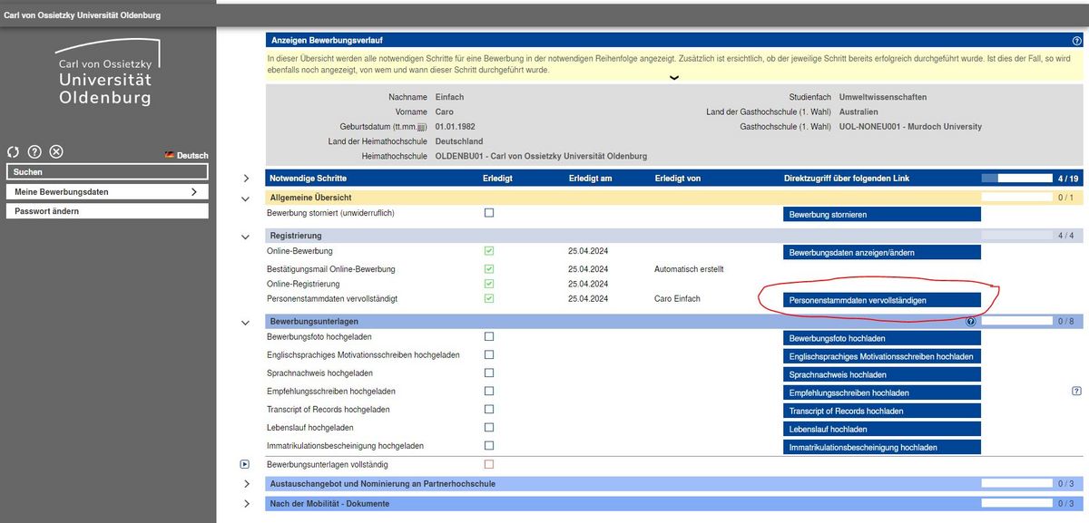 Sie gelangen nun in Ihr individuelles Benutzerportal, das Sie für die Bewerbung und den Aufenthalt im Ausland zum Hochladen von Dokumenten und zur Statuseinsicht nutzen. Vervollständigen Sie hier zunächst Ihre Personenstammdaten und speichern Sie diese ab.