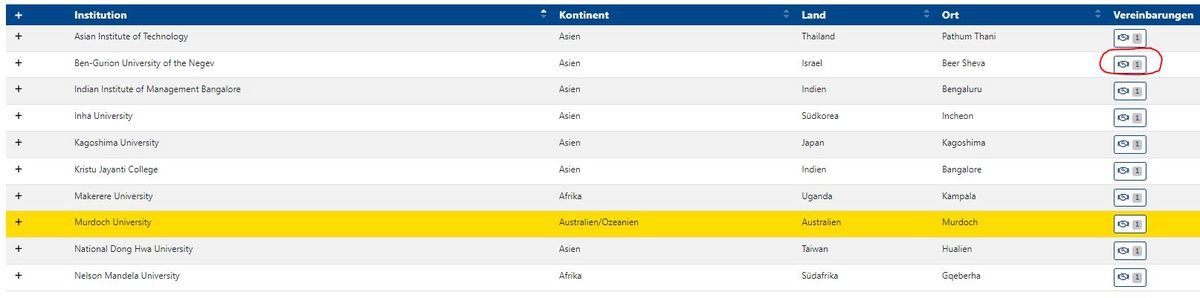Hier sehen Sie nun auf der großen Weltkarte oder unten in der tabellarischen Auflistung alle Austauschuniversitäten, die für Ihre Fachauswahl möglich sind, im Überblick. Ein Klick auf „Vereinbarungen” führt Sie dann auf die Detailseite, wo Sie einen Info-Button (für weitergehende Informationen zur Uni sowie einem möglichen Austauschaufenthalt) sowie einen blauen Bewerbungsbutton finden.