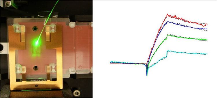 Oberflächen-Plasmon-Resonanz (SPR) Spektroskopie ist eine Biosensortechnologie, die auf der Detektion von Massenänderungen in einem evaneszenten Feld beruht (Abb. 4). Biomoleküle wie z. B. Proteine, Peptide und Nukleinsäuren können auf der Oberfläche von Sensorchips in einer Miniaturflusszelle immobilisiert werden. Mögliche Interaktionspartner werden über die Oberfläche dieses Sensorchips gespült und Wechselwirkungen mit den immobilisierten Molekülen werden über eine Änderung des Brechungsindexes detektierbar. Zeitabhängige Änderungen des Brechungsindexes werden registriert und dienen zur Ermittlung kinetischer Parameter. Wir versuchen insbesondere, mit dieser Methode membrangebundene Prozesse zu untersuchen. Dazu zählen folgende Projekte: