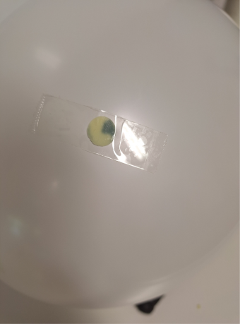 Hierzu wird ein Luftballon mit Wasserstoff befüllt und an unterschiedlichen Stellen Nachweisfolien mit einem durchsichtigen Klebeband befestigt. Bereits nach wenigen Minuten beginnt die Nachweisfolie sich zu verfärben und indiziert den aus dem Ballon ausströmenden Wasserstoff (siehe Bild).