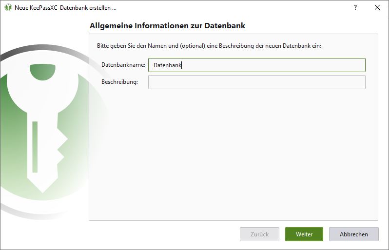- Klicken Sie im Startfenster auf Neue Datenbank erstellen. Es öffnet sich das Fenster „Allgemeine Informationen zur Datenbank“: