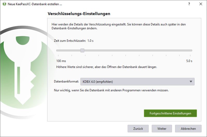 Optional können Sie im Feld Beschreibung eine Beschreibung hinzufügen. - Klicken Sie auf Weiter. Es öffnet sich das Fenster „Verschlüsselungs-Einstellungen“. Wichtig: Alle hier vorgenommenen Einstellungen können Sie später auch in den Datenbank-Einstellungen vornehmen oder ändern.