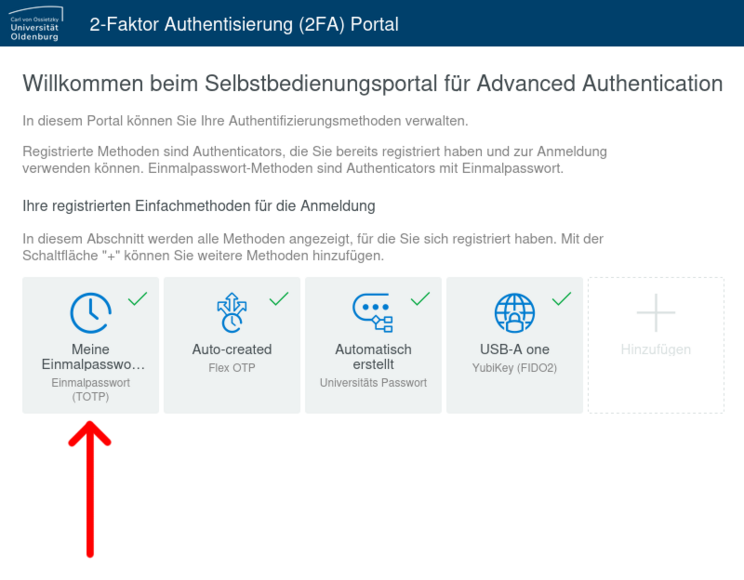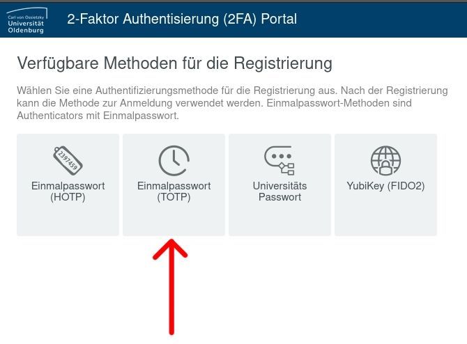 Step 1: Log in to the 2FA portal of the university and click on one-time password (TOTP) in the overview of your authentication methods (or other methods if you want to test them):