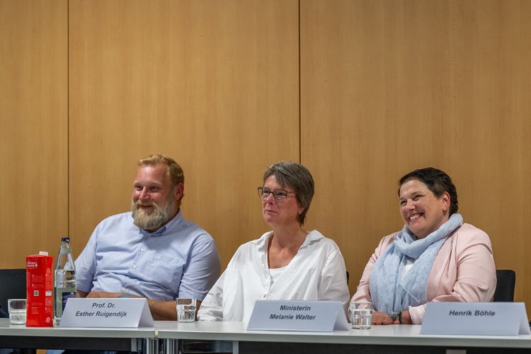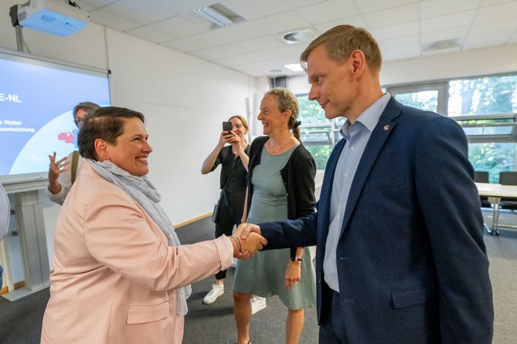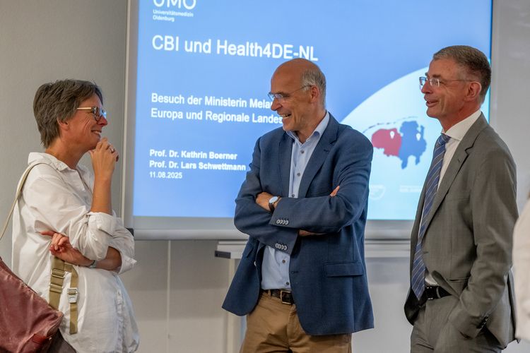 Melanie Walter, the Minister for Europe and Regional Development of Lower Saxony since May 2025, is travelling the region to gain a direct impression of central projects in the districts. Together with the Office for Regional Development Weser-Ems, she stopped at the University of Oldenburg to connect with about 25 representatives from the political sector and the region to learn about the CBI-lead project “Health4 DE-NL”.