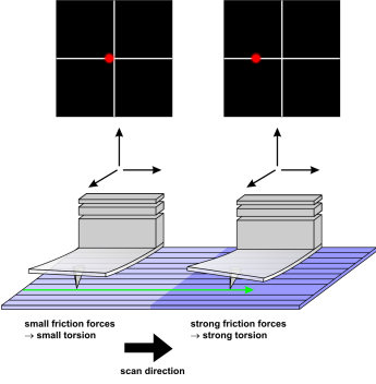 The lateral force mode is a variation of the contact mode. The fast scan direction is roatted by 90° to move the cantilever perpendicular to its longer extension. Due to friction forces between the sample and the tip, the cantilever is distorted. The distortions varies with the „stickiness” of the sample and can be measured by a laser beam directed on a 4-segment photodiode. Form this data a mapping of the local fristion forces can be assembled.