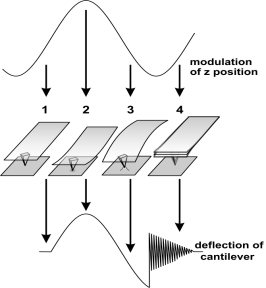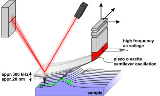 For working in teh Tapping mode, the cantilever is excited to mechanical vibration close to its resonance frequence (ca 10-500 kHz) using a piezoelectric ceramic. If the tip approaches the sample, the amplitude of the vibration is lowered by the interaction between tip and sample. A feedback loop keeps the apmplitude constant ba changing the z-coordinate. By plotting z vs (x, y) coordinates, a topographic image of the sample is obtained. Both mpodes can be operated in air, in liquids and in a vacuum.