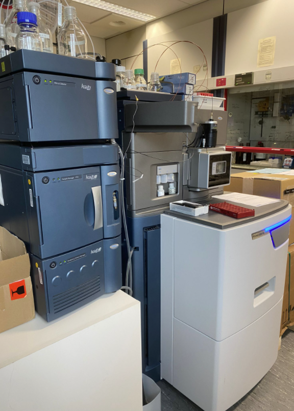 The SYNAPT G2-Si Mass Spectrometry (Waters) is a hybrid quadrupole mass spectrometer with ion mobility and orthogonal acceleration (Q-ToF) that combines high-resolution mass spectrometry (HRMS) with highly efficient ion mobility-based (IMS) measurements and separations. It can be either equipped with a dual-orthogonal API source (LockSpray™ ESI/APCI) or a matrix-assisted laser desorption/ionization (MALDI) ion source. In routine mode the SYNAPT is connected to a Waters ACQUITY UPLC H-Class system to screen metabolites in solution or optional an imaging method (MALDI Imaging Mass Spectrometry for short) for the analysis of chemical components and their spatial distribution within a sample.