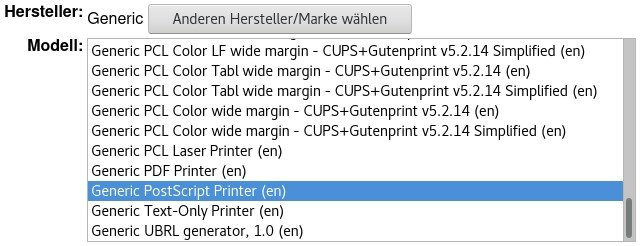 The penultimate step is to select the printer driver. Select "Generic" for the manufacturer and "Generic PostScript Printer (en)" for the model and confirm with "Next".