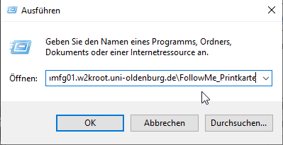 Paste \\ricohmfg01.w2kroot.uni-oldenburg.de\FollowMe_Printkarte into the field next to "Open:" and click "OK".