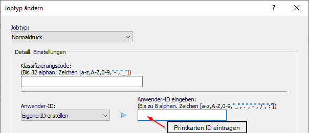 In the 'User ID' selection field, select 'Create your own ID'. Enter the 8-digit print card ID starting with 1500 in the "Enter user ID:" field and confirm with "OK".