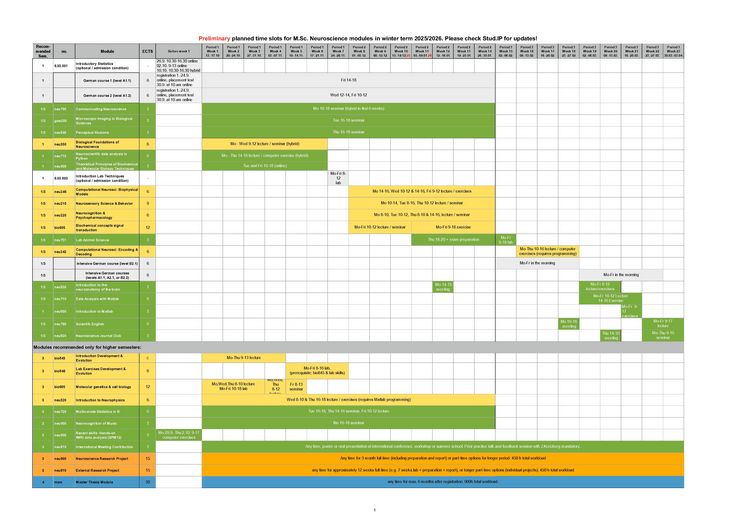 All background modules are full-time block courses lasting 2-3 weeks (6 CP), 4-5 weeks (9 CP), or 6-7 weeks (15 CP). During research modules, students stay for 6-8 weeks full-time in the lab of their chosen supervisor. Alternatively, many supervisors offer part-time internships, in which the project is stretched over a longer period. Skills modules are either block courses during the semester break, or during the semester in the late afternoon hours to be compatible with the other courses.