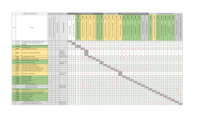 The overview of module combinations in the Master's program in Neuroscience (winter semester 2025/26) serves as a practical guide for planning your studies. It shows at a glance which modules can be taken in parallel and how they can be combined.
