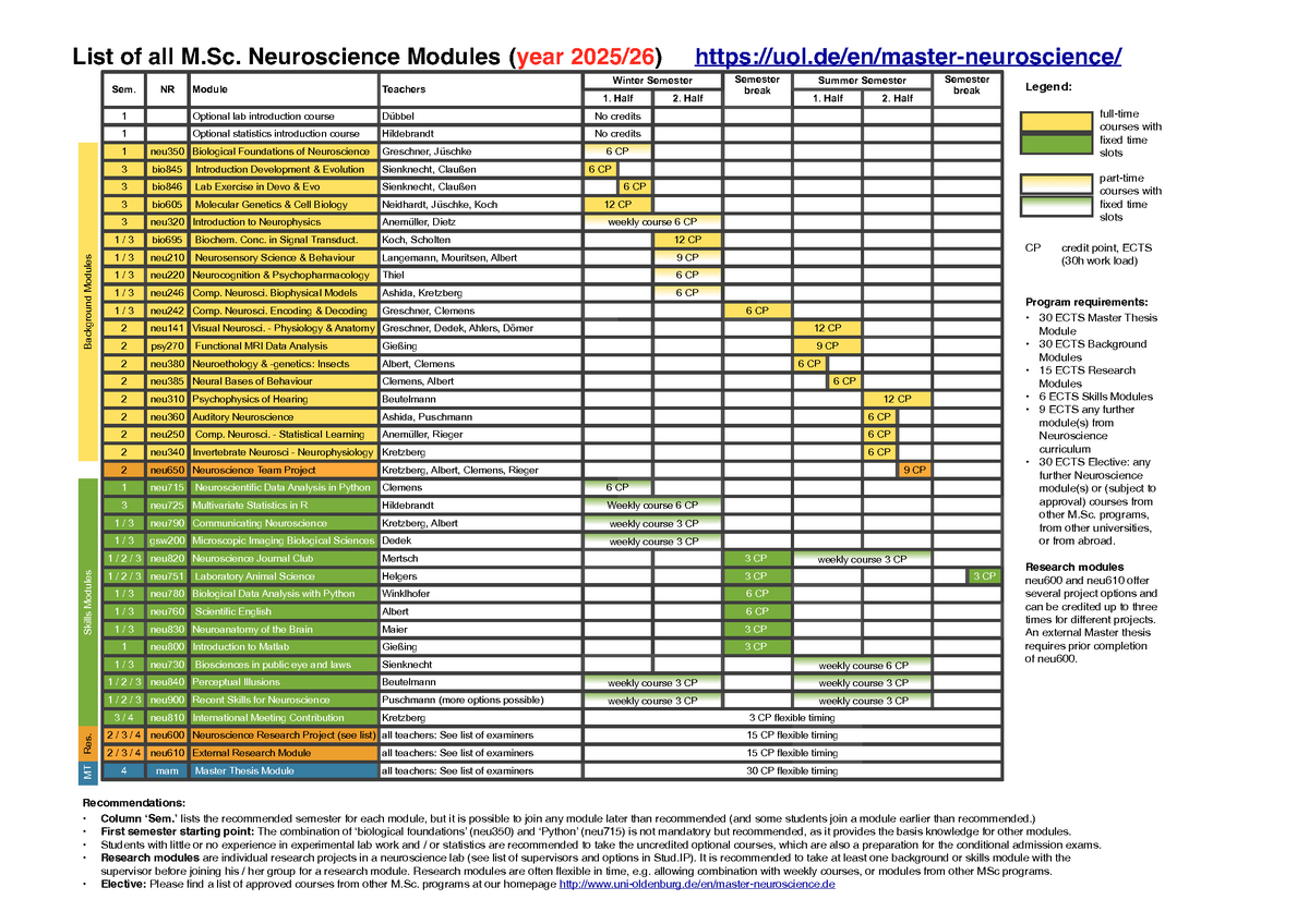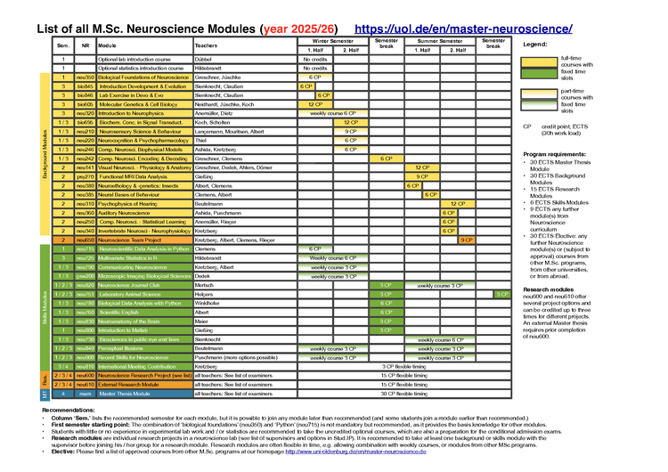 If you want to take a MSc module that is not on this list (e.g. a neuroscience program at a different university in Germany or abroad) you have to get permission by Jutta Kretzberg (head of examination committee) prior to taking the course.