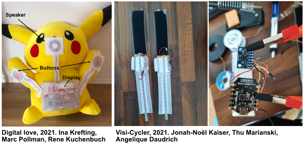 - Digital Love: A pair of teddy bears with embedded sensors and Raspberry Pi's for more tangible communication between couples in long distance relationships. Couples can send each other messages and well wishes by interacting with the palms, bellies etc. and the opposite teddy receives the signal informing the partner their other half is thinking of them. HCI; Ina Krefting, Marc Pollman, Rene Kuchenbuch.