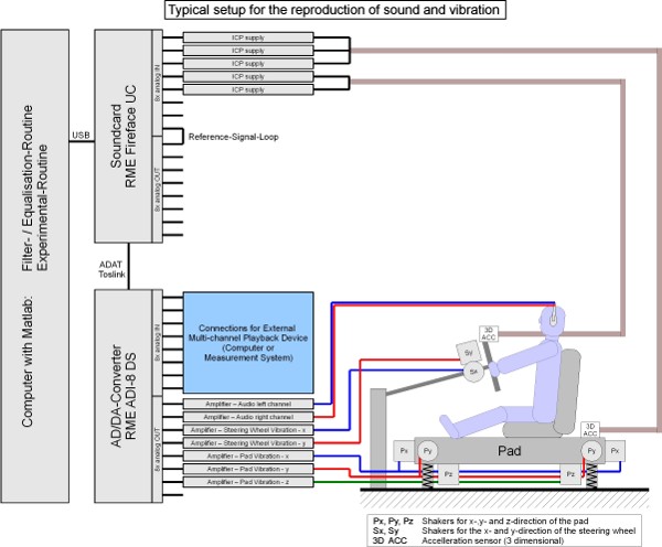 In this "car simulator" a car seat is mounted on a rigid base, which itself is elastically supported. Reactive shakers for all three directions excite the plattform as well as the steering wheel. Sound is reproduced by loudspeakers or by headphones. A subwoofer can be used to extend the low frequency range.