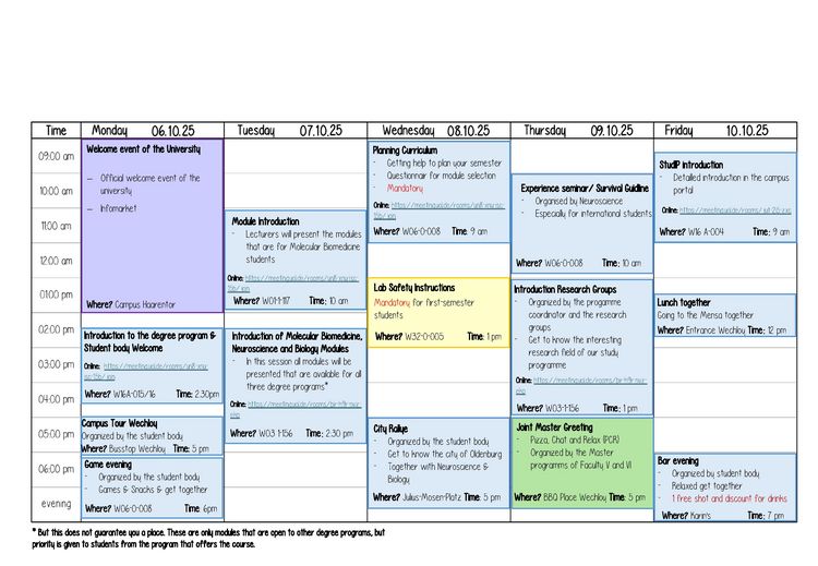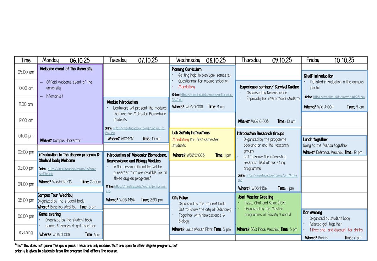 Here is the schedule for the so-called orientation week, which we are still diligently working on. This first week of your new program will provide you with all the important information you need for a smooth and easy start.