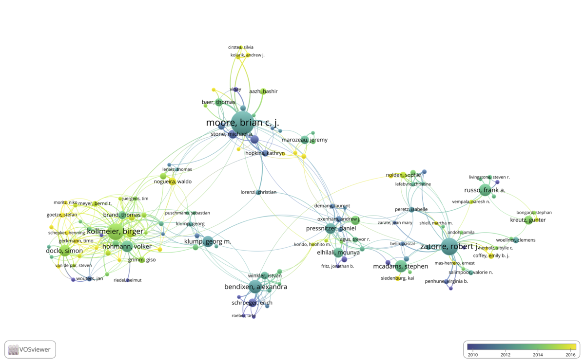 A map of co-authorships within the papers from this estmeed group of auditory scientists: