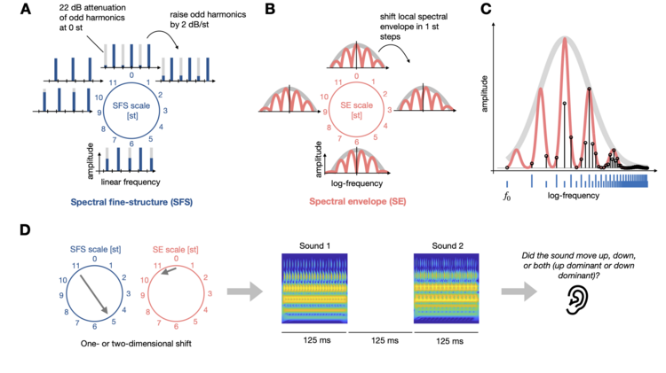 In Siedenburg, Graves, & Pressnitzer (2022), we explore a unifying hypothesis regarding the interaction of spectral fine-structure and spectral envelope cues, commonly understood to affect pitch and brightness perception. We use Generalized Shepard tones with harmonic and inharmonic spacing of partials to address these issues.