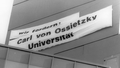 One day after the beginning of term, students apply large letters, which are visible from a large distance, to the tower of the university's AVZ building. The letters spell the name ‘Carl-von-Ossietzky-Universität’. The rectorate regards this initiative as a demonstrative act which expresses the unanimous will of the university.