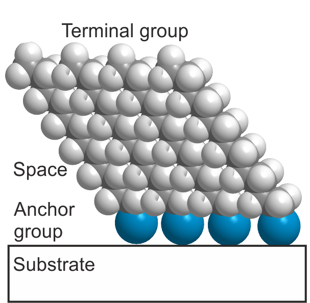 Self-assembled monolayers (SAMs) are ordered arrangements of several molecules that align with each other through intermolecular bonds. Such layers form spontaneously when chain-like, mostly unbranched molecules form a chemical bond between an adhesive anchor group to a surface and the chain-like moieties of several neighboring molecules align with each other (Figure 1). This is different to Langmuir films, where mechanical work is spent to align the molecules.