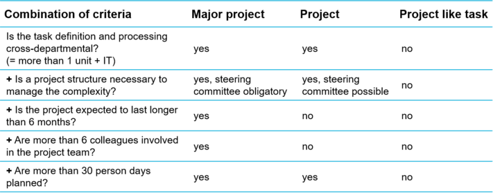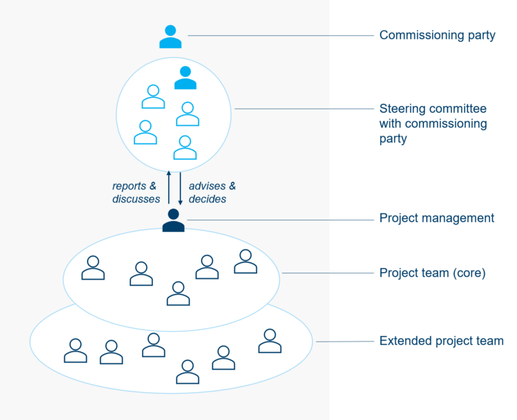 The project organisation should reflect the scope and complexity of the project / major project. Projects in central administration and service areas require at least one commissioning party, one project manager and one project team. Major projects are usually supplemented by a steering committee made up of no more than 5 people.