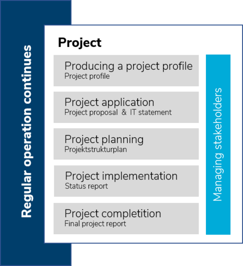 An ideal type of project in central administration “goes through” the phases shown one after the other. This sequence corresponds to the theory of conventional project management. In reality, there are always detours – e.g. when the original plans have to be adapted because of new findings or challenges.