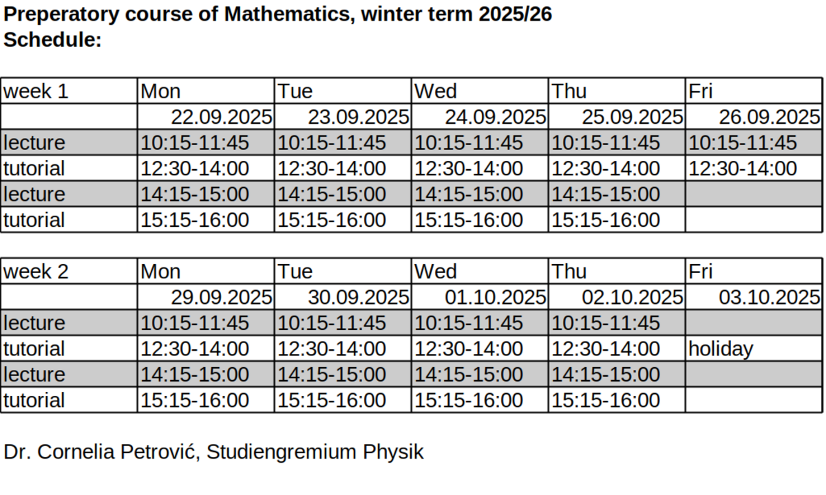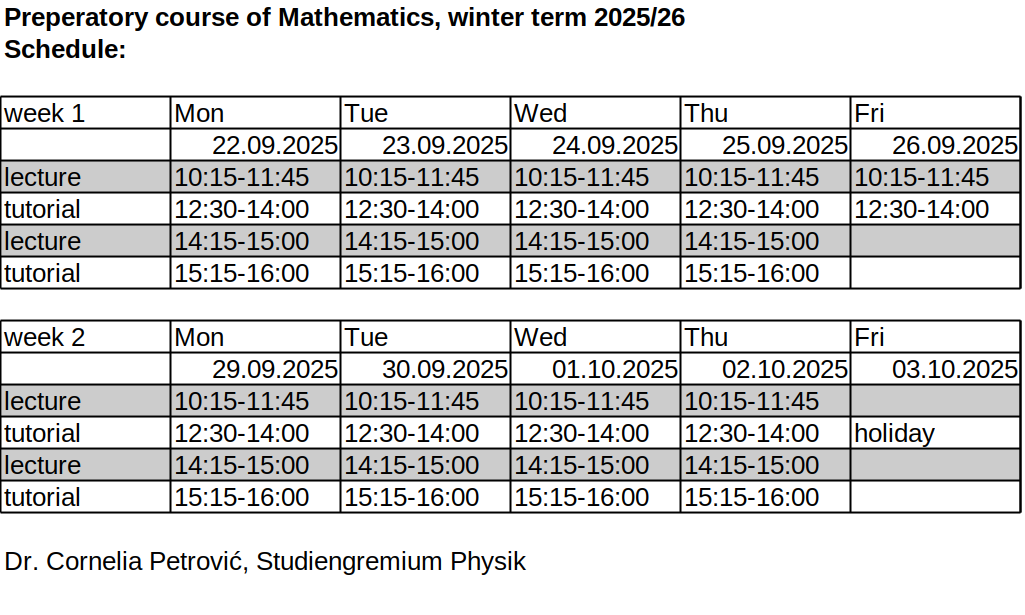 To improve and refresh your basic knowledge of Mathematics, you are strongly advised to attend a two-week preparatory course of Mathematics offered by the Institute of Physics before the lectures of the winter term start. This year, the course takes place 22.09.-02.10.10.2025, starting with a lecture at 10.15 in room W02 1-148 at Campus Wechloy.