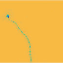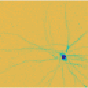 The high number and density of electrodes of the array make it possible to construct a footprint of the recorded cells. This footprint is the average voltage the electrodes record when the cell fires an impulse. Shown below, the footprints of a ganglion cell (left) and a polyaxonal amacrine cell (right) on the array. In the case of the ganglion cell, the impulse migrates along the axon toward the blind spot. In the case of the amacrine cell, the impulses travel across the retina along multiple axons. Amacrine cells play an important role in the lateral inhibition of ganglion cells and thereby in the formation of the response properties of the various types.