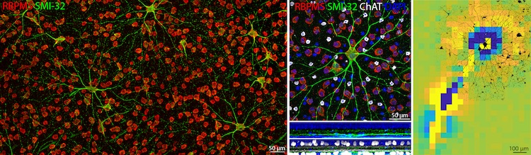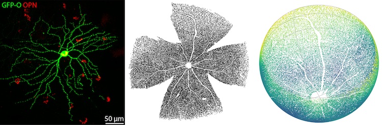 The left panel of the figure above shows a confocal image of a labeled ganglion cell (green) in the mouse retina which is positive for a marker of alpha ganglion cells (red). Each dot in the middle panel represents the location of a ganglion cell body in a complete mouse retina. The right panel shows a transformation of the same data into a sphere. Darker colors indicate higher local densities of ganglion cells.