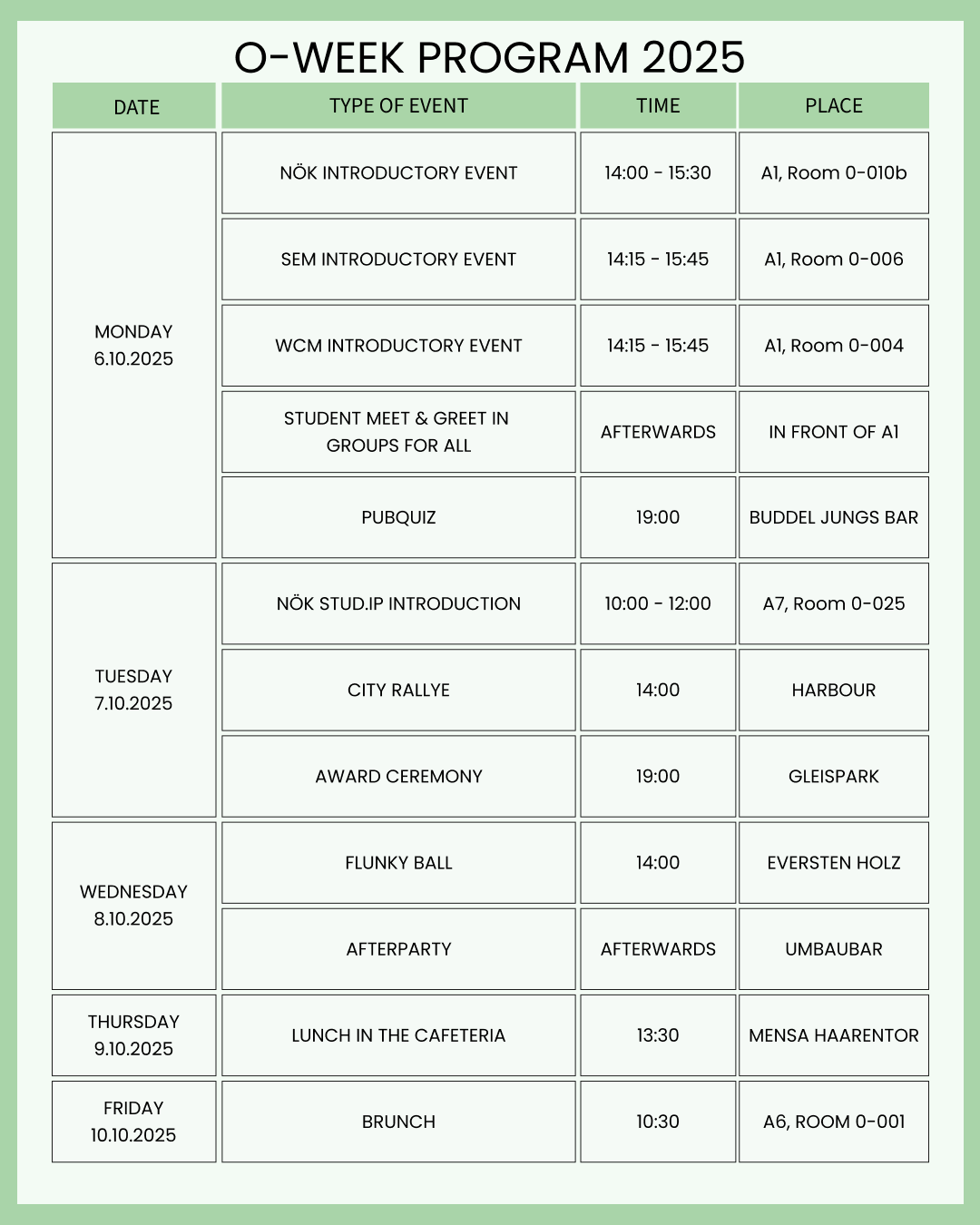 During the week of 6 - 10 October 2025, before the official start of lectures, we want to give you the opportunity to get to know each other in peace and quiet, to get an overview of the campus and the city, and to find out what to expect in the coming months! There will be a mixture of information, games and fun. You will also be accompanied throughout the programme by mentors from the higher semesters, who will be available to answer any questions you may have about your studies or anything else.