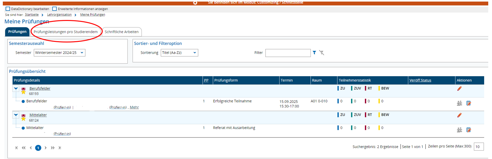 Sie können Leistungen auch für einen einzelnen Studierenden erfassen. Dazu gehen Sie zunächst dieselben Schritte wie bei 5.1..
