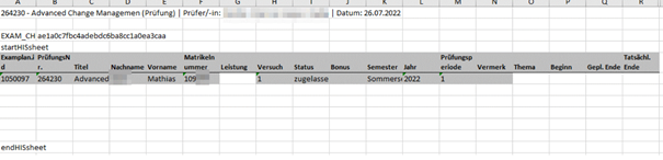 Aus der Prüfung heraus kann eine Teilnehmendenliste in EXA erzeugt werden. Unter „Startseite – „Meine Prüfungen“ können Sie die Teilnehmenden über das Icon „Noten eingeben“ einsehen und als Excel- Liste exportieren (siehe hierzu auch den Punkt „Leistungen erfassen“).