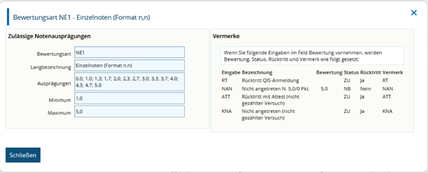 Wenn Sie auf die Lupe klicken erscheint ein Feld, dass Ihnen alle Eintragungsmöglichkeiten für das Feld „Bewertung“ aufzeigt. Hier finden Sie Informationen zur Bewertungsart, wie z.B. zulässige Notenausprägungen oder Vermerke. Das Lupen-Icon finden Sie ebenfalls, wenn Sie Noten über die Funktion „Prüfungsleistung pro Studierendem“ nutzen.