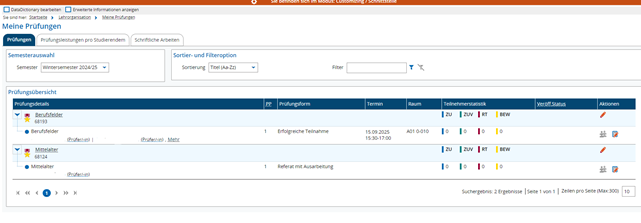 Lehrorganisation: Prüfungen anlegen, Noten eintragen, Teilnehmendenlisten