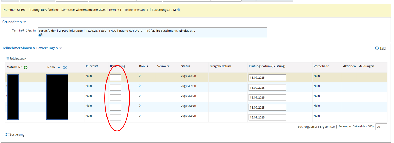 Wenn Sie Noten eingeben, finden Sie unter „Teilnehmer/-innen & Bewertungen“ die Möglichkeit der Feldsetzung.