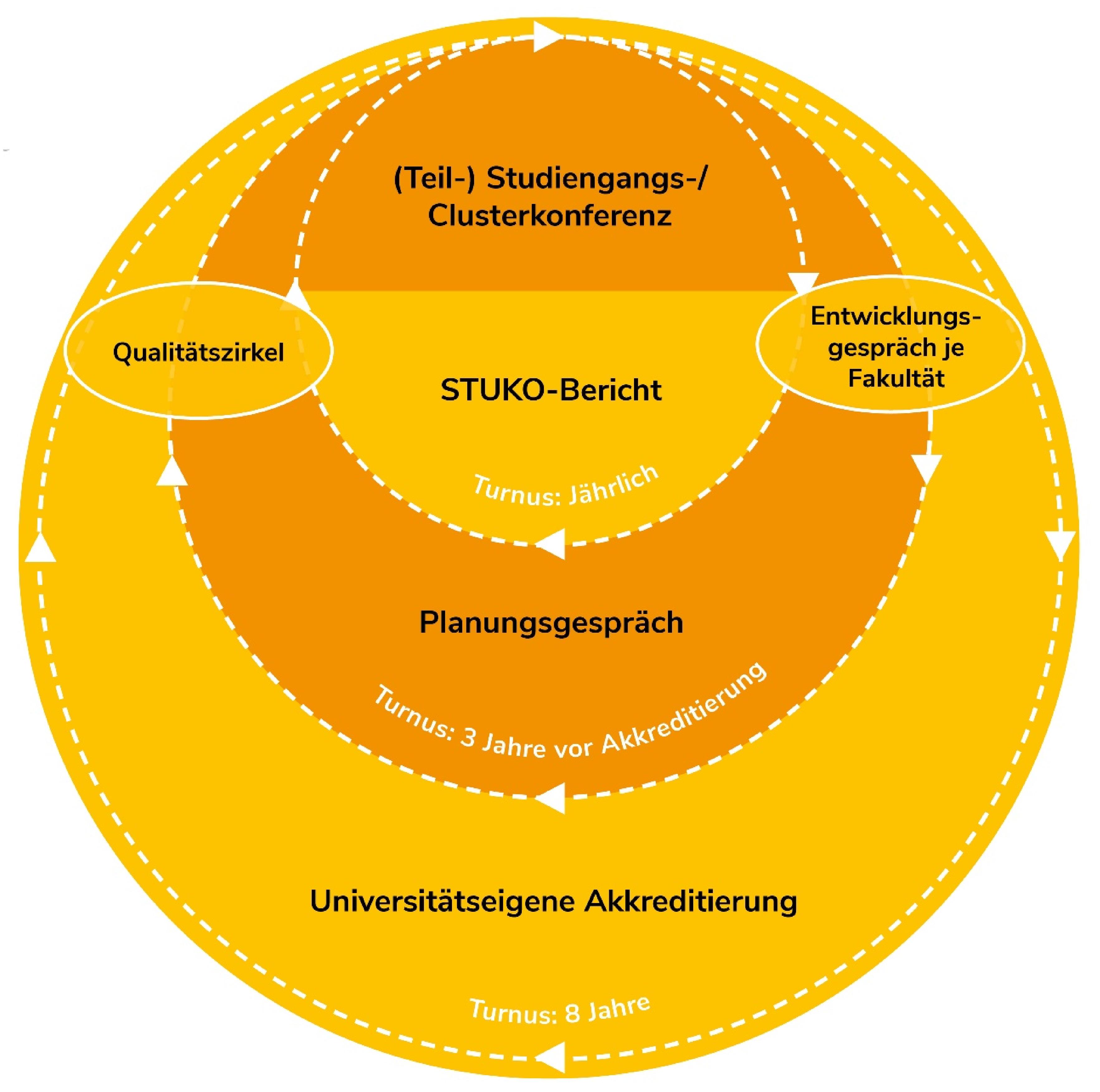 "Der Qualitätskreislauf der UOL besteht aus sechs Elementen und erstreckt sich über einen Zeitraum von acht Jahren. Die Elemente sind dialogorientiert und partizipativ gestaltet. Sie orientieren sich inhaltlich an der Nds. StudAkkVO und dem Leitbild für die Lehre sowie auf Ebene der Fakultäten an dessen Konkretisierungen.