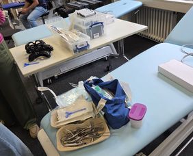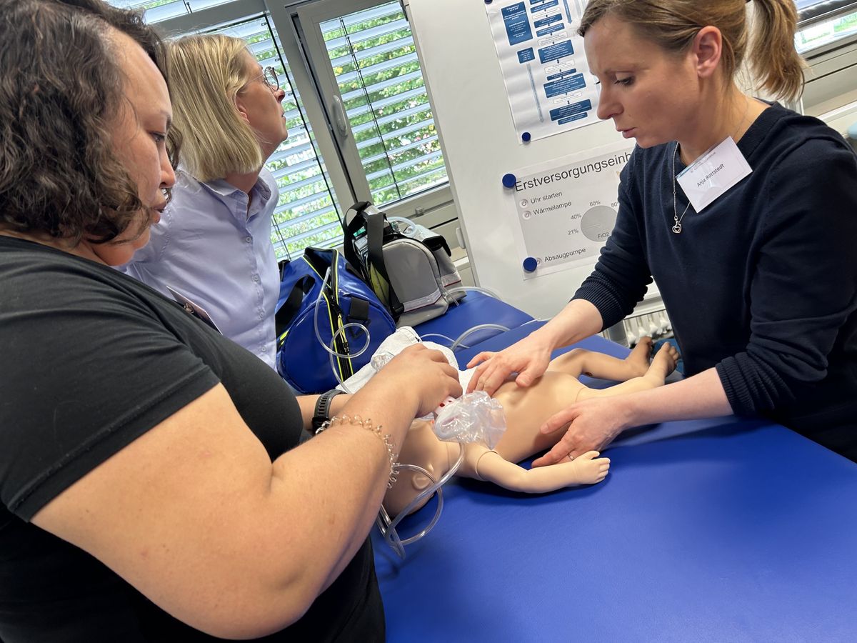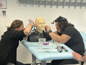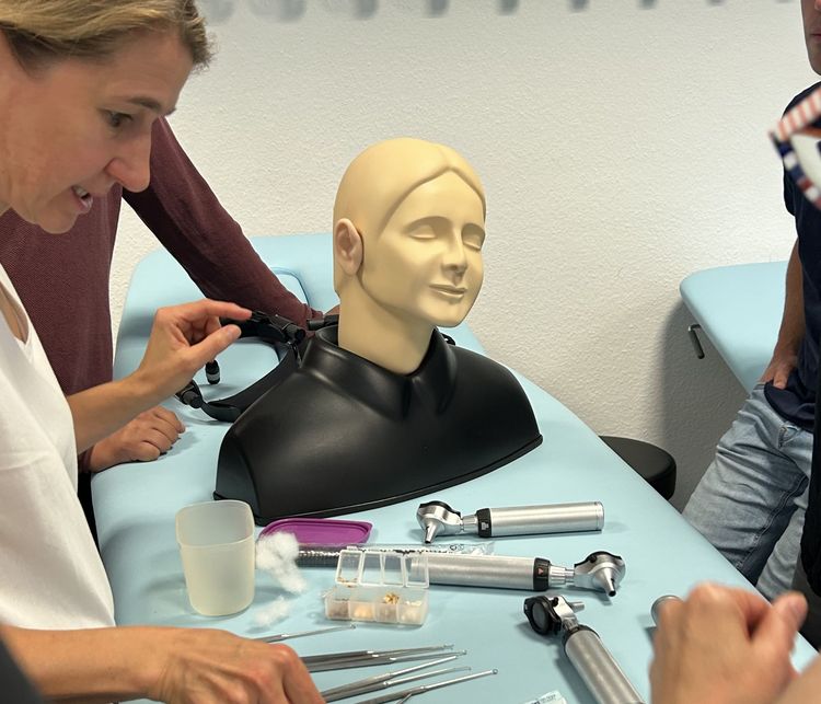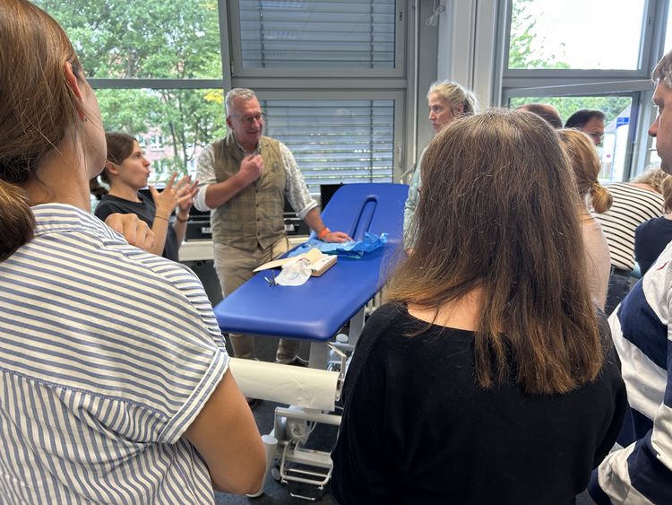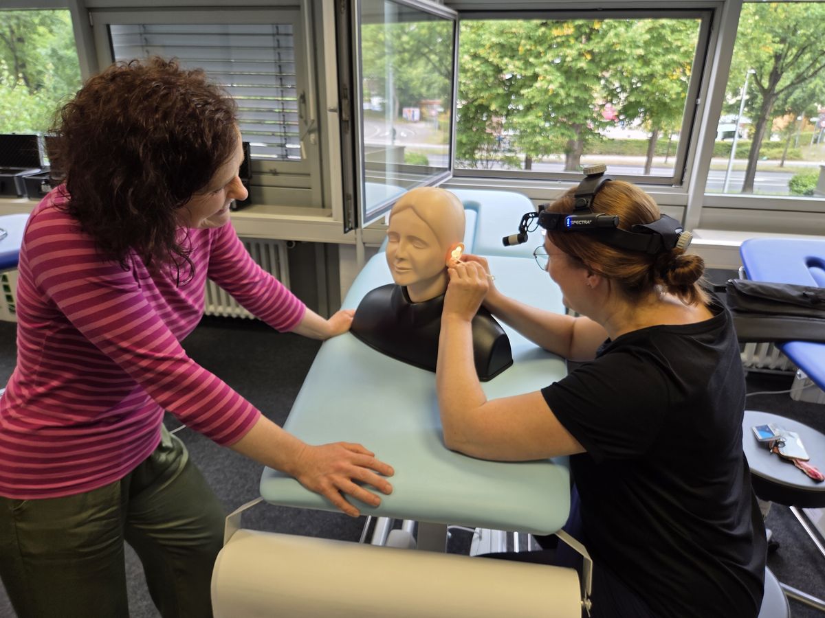 Dabei stand für die HNO Prof. Katrin Radeloff von der Universitätsklinik für Hals-Nasen-Ohrenheilkunde zur Verfügung, für die Augenheilkunde Prof. Stefan Schrader von der Universitätsklinik für Augenheilkunde, für die Psychiatrie Prof. René Hurlemann von der Universitätsklinik für Psychiatrie und Psychotherapie und für die Geburtshilfe Dr. Hansjürgen Augenstein und sein Team von der Klinik für Gynäkologie und Geburtshilfe am EV. Sie zeigten mit zahlreichen Beispielen aus ihrer beruflichen Praxis Behandlungsmöglichkeiten auf und gaben nützliche Tipps für notfallmedizinische Sofortmaßnahmen. Daneben konnten die Teilnehmenden ihr neu erworbenes Wissen gleich in praktischen Übungen vertiefen. Das KTZ verfügt über lebensechte Modelle, medizinische Instrumente und Equipment, um realitätsnahe Übungen durchzuführen.