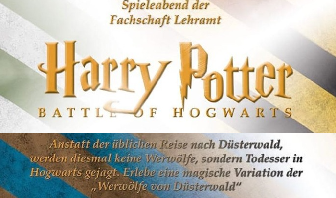 Dank eines ehemaligen Fachschaftsmitgliedes sind wir ebenfalls in dem wertvollen Besitz einer Harry Potter-Variante des Spieleklassikers. Pro Werwolf-Abend gibt es somit als Besonderheit eine Spielegruppe, die Werwolf als Harry-Potter-Version spielen kann. Das Spielsystem funktioniert weiterhin genauso wie in Werwolf, doch es gibt einige neue spannende Regeln (Integration von Hauspunkten) und weitere spannende Rollen!
