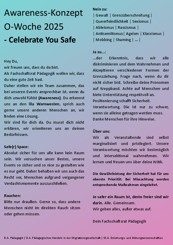 Wir möchten, dass sich alle Teilnehmenden der Orientierungswoche bei uns wohl fühlen. Daher bitten wir darum, dass alle Teilnehmenden respektvoll miteinander umgehen. Sollte jemand sich und/oder andere Personen gefährden, behalten wir uns vor, diese Personen von den weiteren Veranstaltungen der Orientierungswoche auszuschließen.