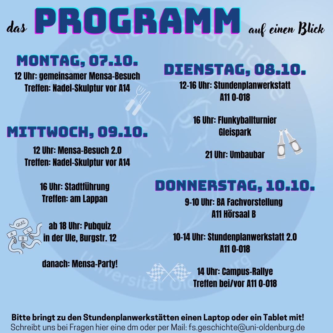Informationen und Updates zur O-Woche findet ihr jederzeit auch auf unserem Instagramkanal @geschichte_oldenburg. Solltet ihr bereits im Vorfeld Fragen haben, sei es zum Studium oder zum Programm, schreibt uns gerne eine DM oder eine Email an [email protected].
