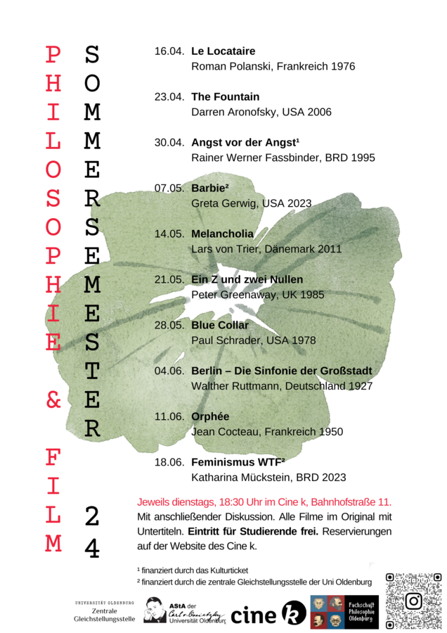 In der Reihe „Philosophie und Film“, welche die Fachschaft Philosophie mit der finanziellen Unterstützung des AStA und der F3V realisieren darf, versuchen wir den präsentierten Filmen das zu entlocken, was nicht nur dem bloßen Material entspricht, sondern im Zusammenhang sich nur zeigt. In einer gemeinsamen Diskussion versuchen wir uns über das Gesehene auszutauschen und so Schritt für Schritt, von den ersten individuellen Eindrücken bis zu den wesentlichen Gehalten des Filmes vorzudringen. Die Intention des Schöpfers muss dabei nicht die wesentliche Rolle spielen, denn oftmals liegt das, was einen Film so sehenswert und erkenntnisreich macht, in seinen Behauptungen darüber oder in seinem Scheitern daran, was er eigentlich darstellen will.
