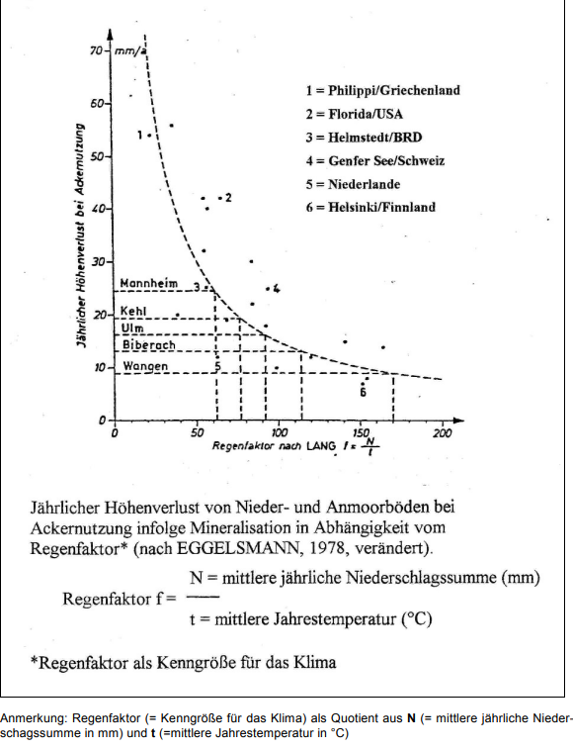 Die Moorsackung durch Ackernutzung ist auch abhängig von der Niederschlagsmenge die durch den Regenfaktor in der Abbildung dargestellt wird. Ein anderes Parameter ist das Klima der Region- hier sind auch innerhalb Deutschlands Unterschiede: im Durchschnitt beträgt die Moorsackung durch Ackernutzung jedoch zwischen 1 und 2mm- also 1,5mm pro Jahr.