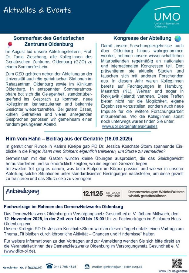 Vom 18.-20. September 2025 hat die Deutsche Gesellschaft für Geriatrie e.V. unter dem Motto Geriatrie Gefragt, Gereift, Gestärkt ihren Jahreskongress veranstaltet. Gemeinsam mit Prof. Dr. med. Tania Zieschang ist ein Teil der wissenschaftlichen Mitarbeiter:innen/ Promotionsstudierenden der Abteilung Geriatrie zum Kongress gereist und hat neben wertvollem Austausch auf nationaler Ebene bestehende Kontakte gepflegt und auch aktiv mit Beiträgen am Kongress teilgenommen.